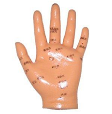 ■用软而光亮的PVC制成的大规格的人手模型,显示手背上的20个穴位和手心上13个穴位,穴位用汉字或数字标注。附中英文使用手册。